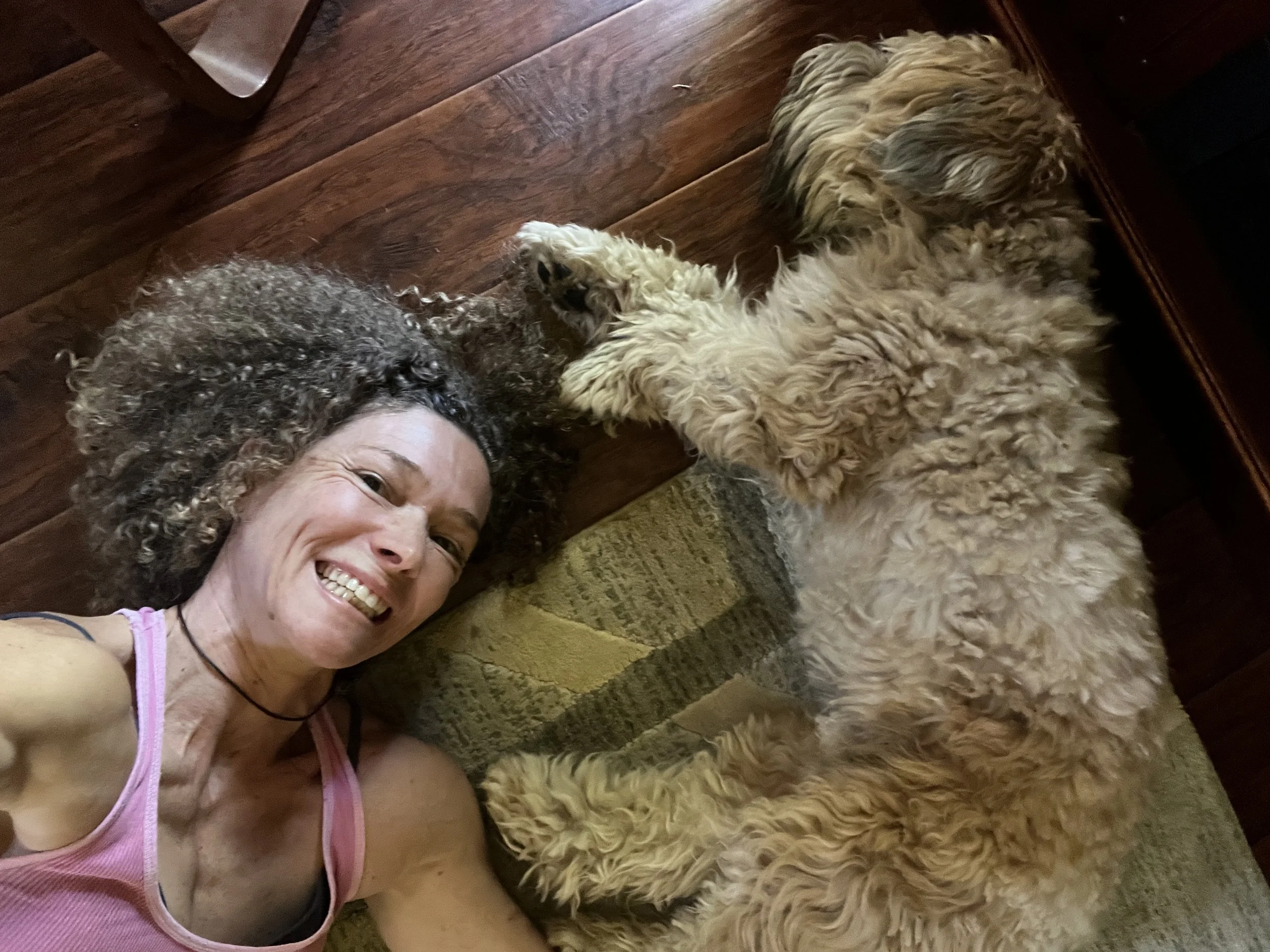 A woman with curly hair lying on a blanket on a wooden floor, smiling, next to a fluffy, light-colored dog lying on its side.