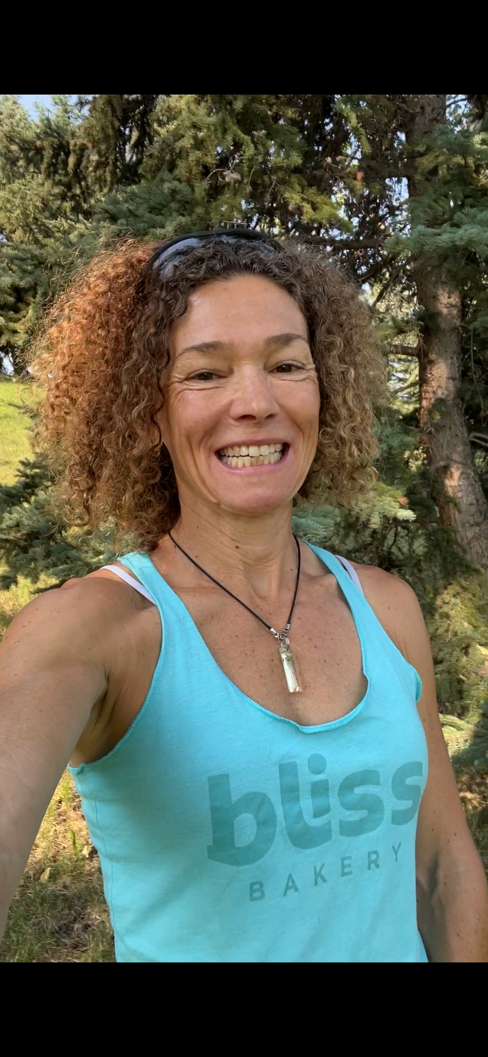 A woman with curly hair smiling outdoors with trees in the background, wearing a blue tank top that says "bliss bakery" and a necklace with a clear pendant.