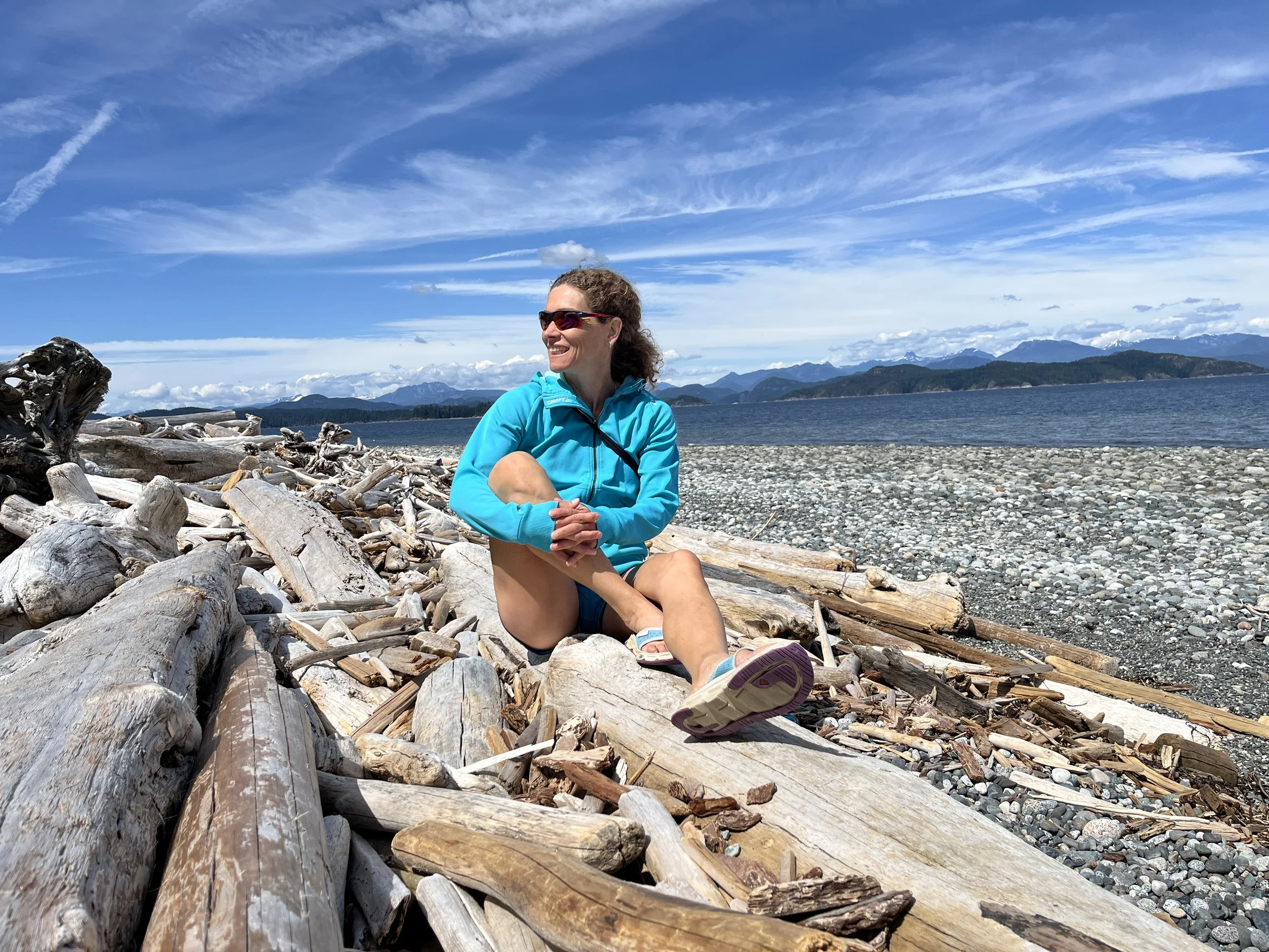 A woman sitting on a driftwood-covered beach, smiling and looking to the side, with mountains, water, and a blue sky with wispy clouds in the background.